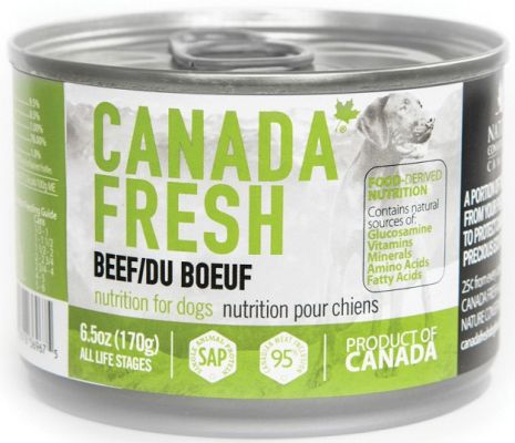 Canada Fresh Beef ingeblikt hondenvoer is gemaakt met natuurlijke ingrediënten uit Canadese kwaliteitsbronnen. Het is geformuleerd met rundvlees en runderbouillon als eerste ingrediënten. Door het gebruik van gezondheidsbevorderende omega's uit zalmolie, gewrichtsvriendelijke glucosamine, samen met taurine, vitamines, mineralen en essentiële aminozuren ontstaat een complete voeding voor honden van alle leeftijden. Wetenschap en natuur Gebruikmakend van Canadese kwaliteitsbronnen Samengesteld om te voldoen aan de voedingsbehoeften in elke levensfase Gemaakt in Canada, en een deel van je aankoop helpt de Canadese ecosystemen te beschermen door Nature Conservancy Canada te steunen. Maten: 12 x 13 oz/doos en 24 x 6,5 oz/doos Voedingsadvies: 1-5 kg (5-15 lbs): 1/3 - 1 blikje per dag (125-375 g) 6-10 kg (13-22 lbs): 1 - 1 1/2 blikjes per dag (375-560 g) 11-15 kg (23-33 lbs): 1 1/2 - 2 blikken per dag (560-750 g) 16-25 kg (34-55 lbs): 2 - 2 3/4 blikken per dag (750-1025 g) 26-40 kg (56-90 lbs): 2 3/4 - 4 blikjes per dag (1025-1400 g) 41-50 kg (91-110 lbs): 4 - 5 blikjes per dag (1400-1700 g) 61-70 kg (131-155 lbs): 5 - 6 blikjes per dag (1700-2200+ g)