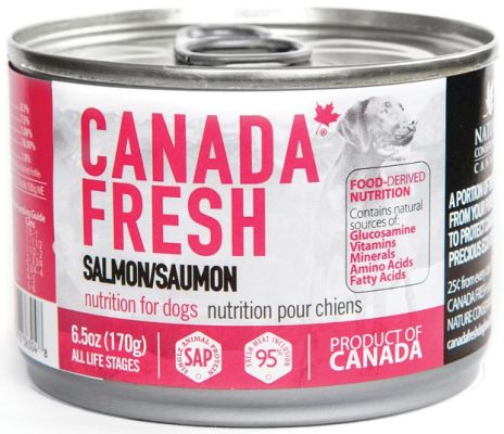 Canada Fresh Zalm hondenvoer in blik is gemaakt met natuurlijke ingrediënten uit Canadese kwaliteitsbronnen. Het is geformuleerd met zalm en zalmbouillon als eerste ingrediënten. Door het gebruik van gezondheidsbevorderende omega's uit zalmolie, gewrichtsvriendelijke glucosamine, samen met taurine, vitamines, mineralen en essentiële aminozuren ontstaat een complete voeding voor honden van alle leeftijden. Wetenschap en natuur Gebruikmakend van Canadese bronnen van hoge kwaliteit Samengesteld om te voldoen aan de voedingsbehoeften in elke levensfase Gemaakt in Canada, en een deel van je aankoop helpt de Canadese ecosystemen te beschermen door Nature Conservancy Canada te steunen. Maten: 12 x 13oz/doos en 24 x 6,5oz/doos Voedingsadvies: 1-5 kg (5-15 lbs): 1/3 - 1 blikje per dag (125-375 g) 6-10 kg (13-22 lbs): 1 - 1 1/2 blikjes per dag (375-560 g) 11-15 kg (23-33 lbs): 1 1/2 - 2 blikken per dag (560-750 g) 16-25 kg (34-55 lbs): 2 - 2 3/4 blikken per dag (750-1025 g) 26-40 kg (56-90 lbs): 2 3/4 - 4 blikken per dag (1025-1400 g) 41-50 kg (91-110 lbs): 4 - 5 blikken per dag (1400-1700 g) 61-70 kg (131-155 lbs): 5 - 6 blikjes per dag (1700-2200+ g)