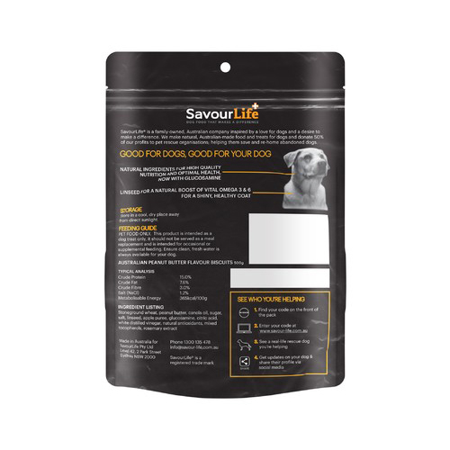 Onze Savourlife Peanut Butter Biscuits zijn gemaakt van 100% natuurlijke ingrediënten, waaronder echte pindakaas en hoogwaardig grasgevoerd rundvlees. Het is een heerlijke traktatie die perfect is voor honden van alle leeftijden en rassen.