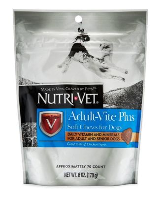 Nutri-Vet Adult-Vite Plus Soft Chews bieden een balans van de beste vitamines voor honden, samen met mineralen, antioxidanten en andere essentiële voedingsstoffen die niet altijd in hondenvoer voorkomen. Deze hondenvitaminen met kippensmaak zijn ontworpen om de gezondheid te optimaliseren en bevatten ook componenten die belangrijk zijn voor oudere honden, waaronder taurine en vitamine C en E.