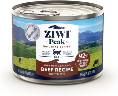 Als obligate carnivoren hebben katten voeding nodig die rijk is aan dierlijke eiwitten en weinig koolhydraten. Ziwi Peak Cat Canned-recepten zijn 93% vlees, organen en botten, inclusief 3% groene mossel voor natuurlijke glucosamine en chondroïtine, en 7% soortspecifieke pens, voor extra smakelijkheid en spijsverteringsvoordelen. Een optie met één eiwit voor katten met eiwitallergieën of -gevoeligheden. Ziwi Beef is alleen afkomstig van lokale Nieuw-Zeelandse boerderijen, zodat de dieren vrij rondlopen, grasgevoerd en afgewerkt zijn. Veel katten hebben ook een lage natuurlijke dorstdrift en kunnen baat hebben bij het hogere vochtgehalte van ingeblikt voedsel. De ingeblikte recepten van Ziwi Peak bevatten geen granen, aardappelen, maïs, tarwe, soja, suikers, glycerine, carrageen, agar-agar, guargom, natriumtripolyfosfaat of tetranatriumpyrofosfaat. In plaats daarvan gebruiken we kikkererwten als natuurlijk bindmiddel voor de ingrediënten met een hoog vleesgehalte. Onze blikken hebben ook een BPA-vrije voering. Alle Ziwi Peak recepten zijn compleet en uitgebalanceerd voor alle rassen en levensfasen. Ziwi Peak Moist Beef kan helpen bij het promoten van: Verminderde voedselallergie gevoeligheden Gezonde huid en vacht Verbeterde spijsvertering Gezamenlijke gezondheid en mobiliteit Urine gezondheid Maten: Enkele 3oz, Enkele 6.5oz, 12x6.5oz en 24x3oz Voedingsinstructies voor blik van 3oz: Volwassene: voer 2 blikken voor elke 4 kg/8,8 lbs lichaamsgewicht van de kat per dag. Kittens, drachtige en zogende poezen: Voer een dubbele hoeveelheid van de volwassen voeding in 2 - 3 voedingen per dag. Voedingsinstructies voor blik van 6,5 oz: Volwassene: voer 1 blikje voor elke 3 kg/6,6 lbs lichaamsgewicht van de kat per dag. Kittens, drachtige en zogende poezen: Voer een dubbele hoeveelheid van de volwassen voeding in 2 - 3 voedingen per dag.