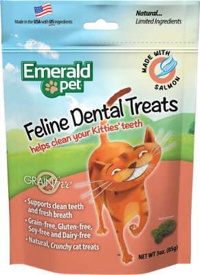 Emerald Pet Feline Dental Treats zijn de gezonde, graanvrije tandheelkundige traktaties waar u naar op zoek was. Deze knapperige, volledig natuurlijke en voedzame lekkernijen helpen de vorming van tandplak en tandsteen te verminderen door het gebruik van innovatieve ingrediënten voor het welzijn van uw kat. Het heilzame calciumcarbonaat, een natuurlijk schuurmiddel dat in tandpasta wordt gebruikt, helpt tanden schoon te schrapen. Glucono delta-Lactone, een natuurlijk plantaardig ingrediënt, werkt om te voorkomen dat tandsteen en tandplak aan de tanden van de kat blijven kleven. Omega 3 en Omega 6 uit onze zeevruchteningrediënten bevorderen een gezonde huid en glanzende vacht. Deze lekkernijen zitten boordevol ingrediënten waar je kat dol op zal zijn. Zoals alle Smart n' Tasty-producten, worden onze lekkernijen gemaakt in de VS met alle natuurlijke Amerikaanse ingrediënten. Graanvrij, glutenvrij, zuivelvrij, sojavrij zonder kunstmatige ingrediënten, kleuren of smaken. Natuurlijk bewaard gebleven. Slechts 2 calorieën per traktatie.