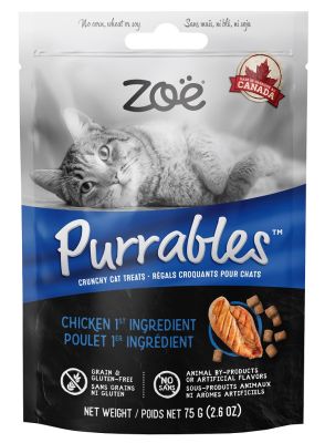 Zoë Purrables, gemaakt in Canada, zijn heerlijke graan- en glutenvrije knapperige kattensnoepjes. Geformuleerd zonder dierlijke bijproducten, zonder maïs, tarwe of soja en kip als eerste ingrediënt, zullen deze lekkernijen uw kat laten spinnen van genot.