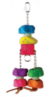 Prevue Pet Products Cosmic Crunch-speelgoed is gemaakt van 100% natuurlijk, verteerbaar gemalen calcium met echte zeeschelpen! Je vogel zal het speelgoed "wegscheren", waardoor snavels en nagels geknipt blijven terwijl het langer meegaat dan andere soorten speelgoed. Gemaakt met 100% FD&C-kleuren, leren strips en glow-in-the-dark-kralen (effect duurt 20 minuten).