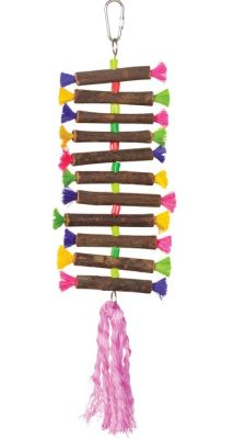 Prevue Pet Products Tropical Teaser Twisting Sticks vogelspeelgoed bestaat uit rotanstroken, geknoopte katoenen touwen, plastic slangen, plastic kralen, veren en kokosvezel. Alle materialen zijn 100% veilig, niet giftig en het speelgoed zelf is eenvoudig te bevestigen met een snelkoppeling. Deze lijn is gericht op nestbouw en snaveloefeningen.